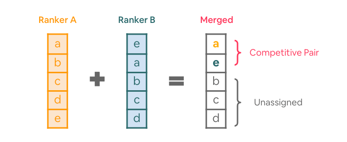 2. 1 From each of the two rankers A and B take the highest-ranked result that has not yet been selected (say listing a from ranker A and e from ranker B).