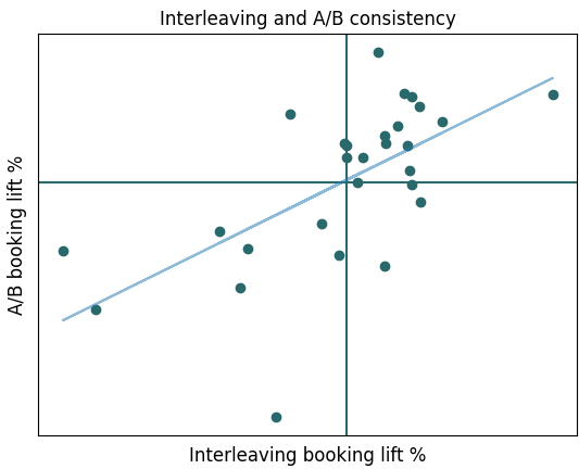 Figure 6: Interleaving and A/B consistency. We tracked eligible interleaving and A/B pairs and the results demonstrate that the two are consistent with each other 82% of the time