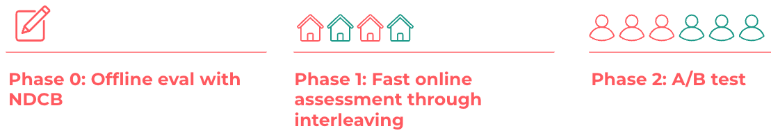 Figure 2: Ranking experimentation procedure. We use interleaving to get preliminary online results in order to enable fast iteration