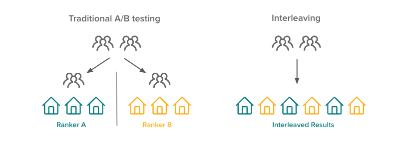 Figure 1: An illustration of A/B testing v.s. Interleaving. In traditional A/B tests, users are split into two groups and exposed to two different rankers. In Interleaving, each user is presented with the blended results from two rankers.