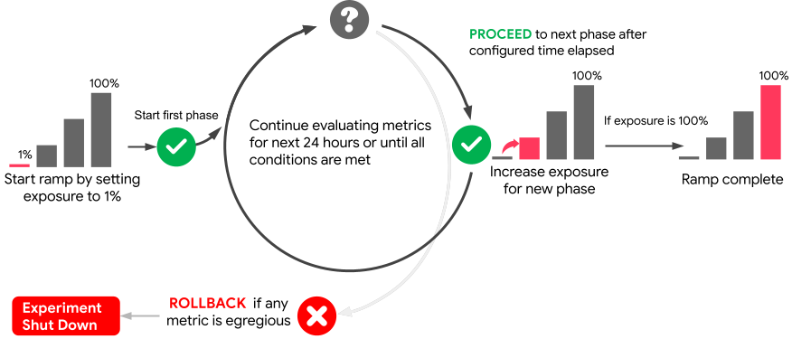 The Ramp Controller performs automated experiment ramping based on the results from Measured. It increases experiment exposure in stages, slowly exposing more subjects and monitoring metric impacts at each stage. If any egregiously negative metric is observed, the Ramp Controller will immediately shut down the experiment to minimize the impacts of bad changes. It supports several ramping algorithms, but most users leverage a simple time based algorithm.