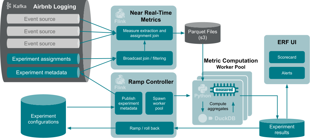 - Measured, a python library (invoked via a Python HTTP server and worker pool) that consumes enriched measures from S3, aggregates them, and runs stats to determine if any change is significant.