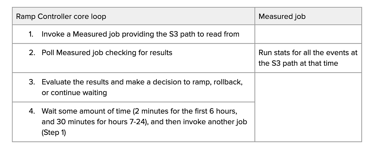 Ramp Controller was designed to be stateless, and resilient to any job failures. Within seconds of an experiment starting, it publishes metadata to Kafka, triggering NRT to start joining events for that experiment. The metadata includes a path in S3 that NRT will write to. At this point the Ramp Controller’s core loop will begin: