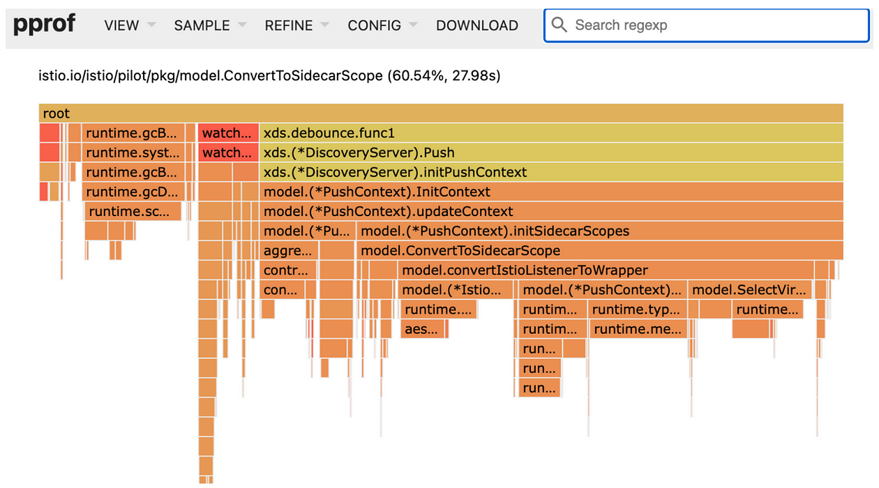 After the DeepCopy improvement, the next big chunk from the cpu profile was the ConvertToSidecarScope function. This function took a long time to determine which virtual services were imported by each Istio proxy. For each proxy egress host, Istiod first computed all the virtual services exported to the proxy’s namespace, then selected the virtual services by matching proxy egress host name to the virtual services’ hosts.