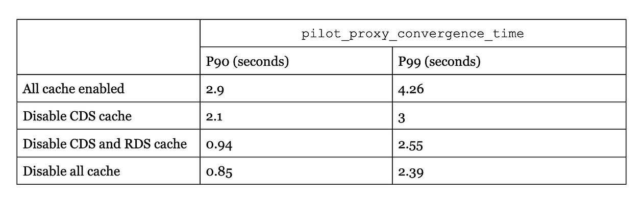But why turning off both CDS and RDS cache does not solve the problem? By looking at where the cache was used when building RDS, we found out that the flag PILOT_ENABLE_RDS_CACHE was not respected. We fixed that bug and conducted performance testing in our test mesh to verify our hypothesis with the following setup: