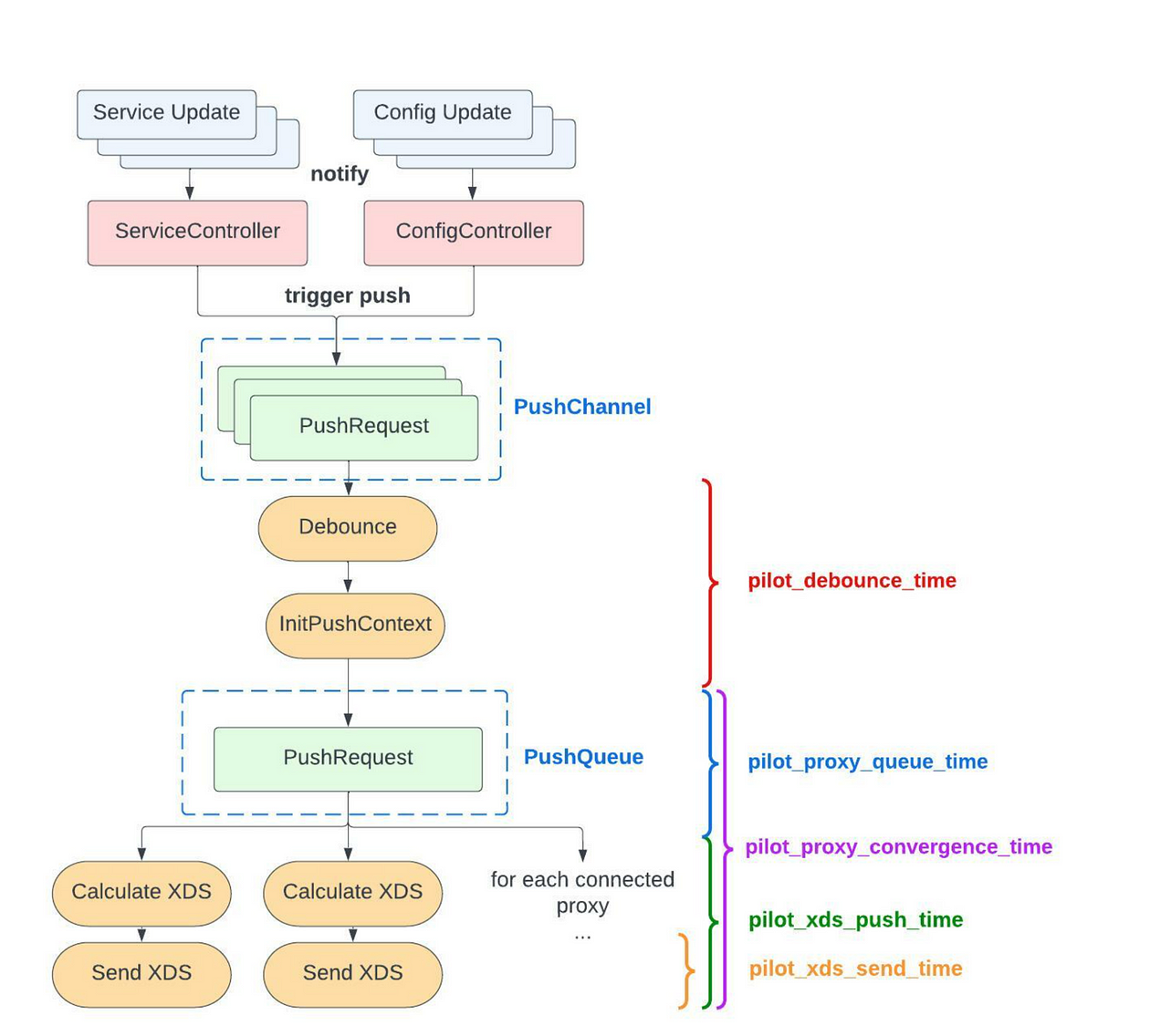 - pilot_proxy_convergence_time — measures the time from when a push request is added to the push queue to when it is processed and pushed to a workload proxy. (Note that change events are converted into push requests and are batched through a process called debounce before being added to the queue, which we will go into details later.)